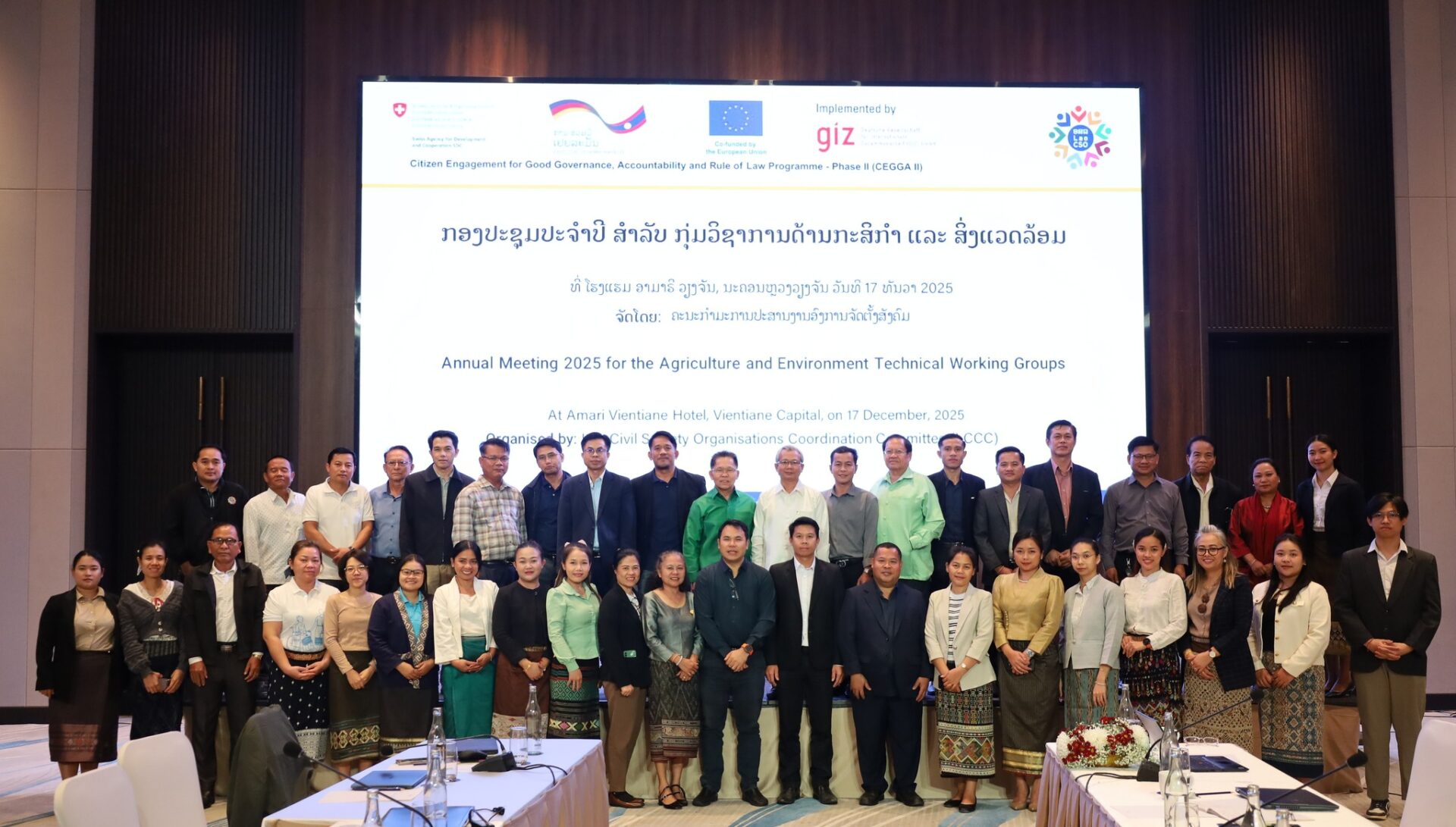ວັນທີ 17 ທັນວາ 2025 – ຄະນະກຳມະການປະສານງານອົງການຈັດຕັ້ງສັງຄົມລາວ (LCCC) ໄດ້ຈັດກອງປະຊຸມປະຈຳປີ 2025 ສຳລັບກຸ່ມວິຊາການດ້ານກະສິກຳ ແລະ ສິ່ງແວດລ້ອມ ຢ່າງເປັນທາງການ ໂດຍມີຜູ້ເຂົ້າຮ່ວມກວ່າ 60 ທ່ານ ຈາກພາກສ່ວນອົງການຈັດຕັ້ງສັງຄົມ, ພາກລັດ, ຄູ່ຮ່ວມພັດທະນາ ແລະ ພາກທຸລະກິດ.
